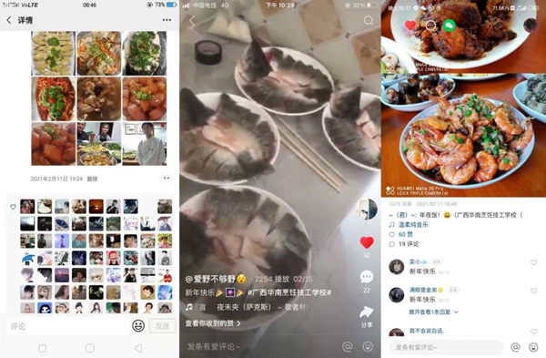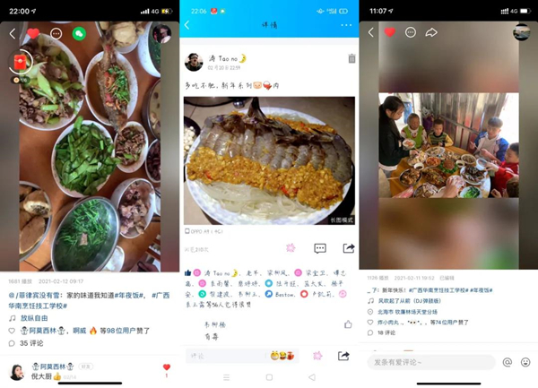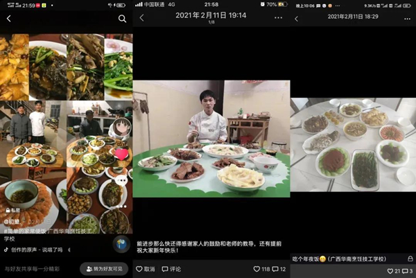 无论是拿手菜肴的制作,还是阖家团圆的温暖场面,都是一份珍贵的回忆。年夜饭是新旧更替的见证者,更是全家人团圆欢聚的重要时刻。在这阖家团圆、幸福温暖的时刻,华南学子们能够通过自己在校所学的技能亲手为家人做上一道菜肴,感恩家人,分享心底的喜悦,同时也向我们传递了温暖和温馨。