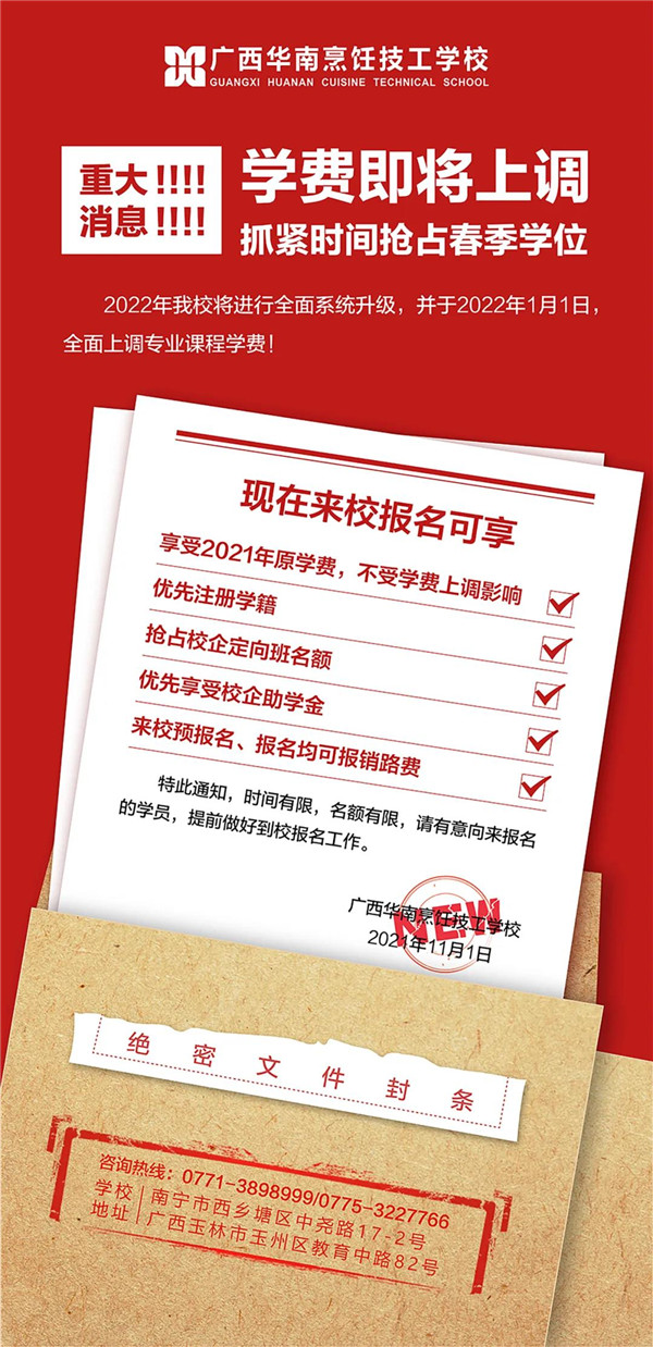 每年春季都是一个入学高峰期,提前注册学籍,锁定热门专业,避免排队等待入学资格。此外,广西华南烹饪技工学校拥有国内外优秀师资团队全程护航教学,热门专业+名师亲授,让你名师名校出名门。