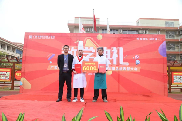 紧接着,激动人心的表彰颁奖仪式来啦!校区领导们依次对本学期获得“国家奖学金”、“自治区奖学金”等大批同学们进行表彰,同时对在上周举办的2021华南杯烹饪技能大赛中获得金奖、银奖、铜奖的同学们进行颁奖。这一张张的奖状,是同学们踏实成长的足迹,是老师们辛勤耕耘的汗水,激励着每一位华南学子去努力、去坚守、去超越、去创新。老师们也以此鼓励在场的所有学子,以优秀为榜样,2022继续烹饪灿烂人生。