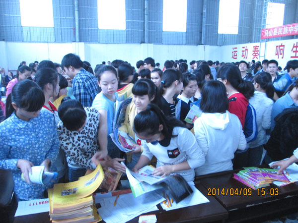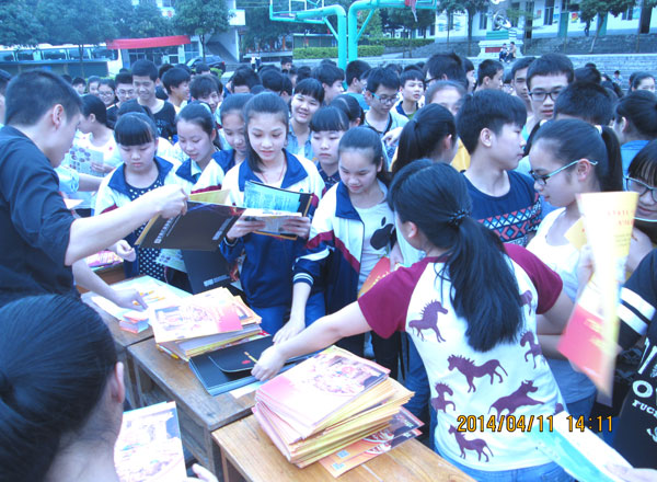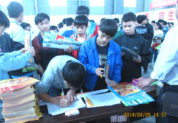 此次我校同“大蓬车”开展宣传,受到各校学生的热情追捧,高端大气的学校宣传手册更是吸引众多学生眼球,很多学生纷纷咨询,“哥哥,你们学校环境好吗,毕业后包不包就业,主要做什么工作”,“学校的住宿条件好吗”等等,得知这两位阳光帅气的老师是学校招生负责人,一大群初三男生、女生立即围上来,询问各种问题,咨询者留下自己的姓名、联系电话、QQ号等资料,方便今后继续联系,我校展位宣传几乎被挤爆!