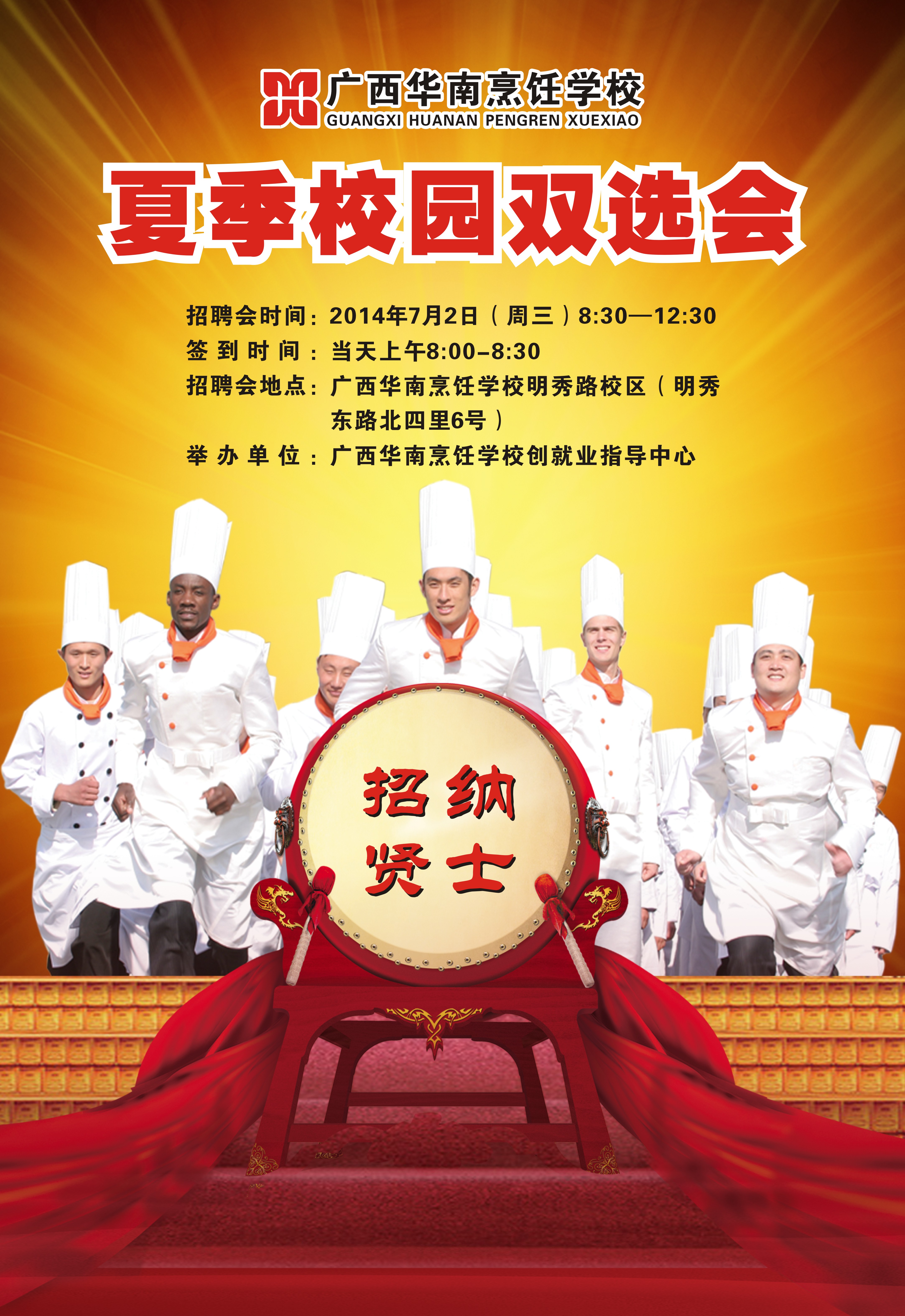 为方便贵企业到我校选聘合适的人才,更好地促进我校毕业生顺利就业,我校定于2014年7月2日(星期三)举办“2014广西华南烹饪学校夏季校园双选会”。具体安排如下: