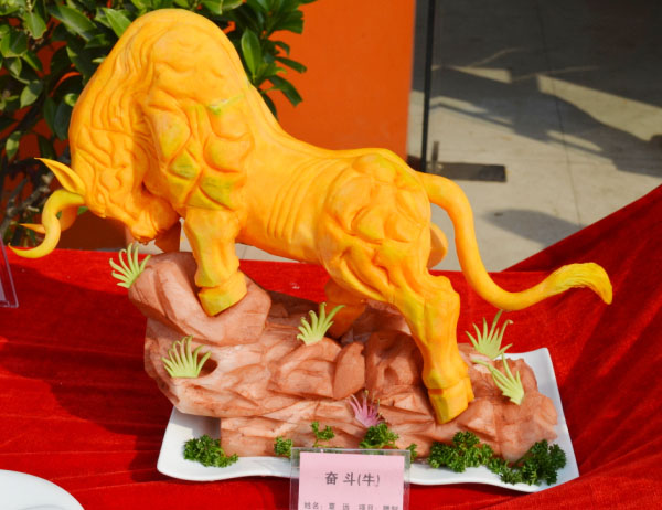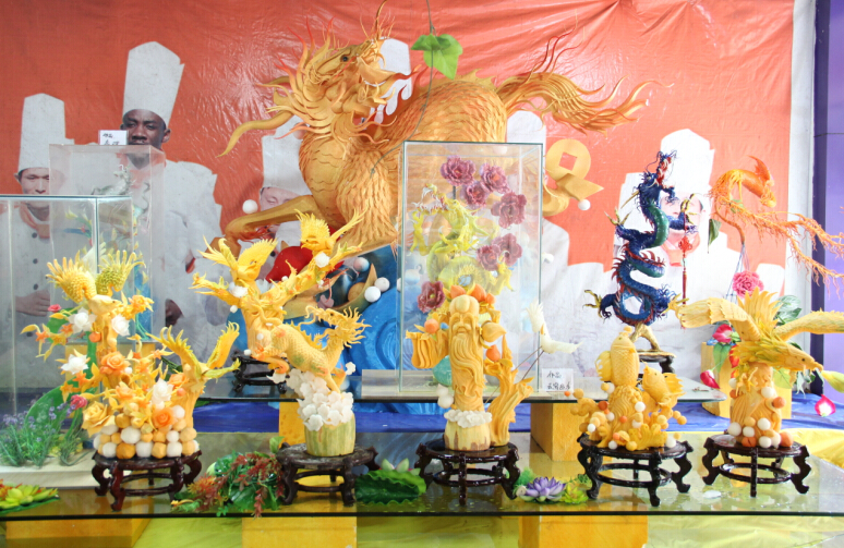 一幅幅用西瓜雕刻而成的艺术品,各种红瓤、黄瓤的西瓜被雕成玫瑰花、牡丹花、动物和人物头像等,食物雕刻学生利用西瓜的红瓤绿皮雕成立体生动的各种艺术品。