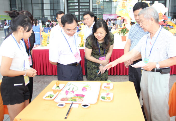 自治区领导正在食品拼盘展区进行参观!广西华南烹饪学校的参赛选手们精湛的拼盘作品得到了领导们的一致认可!