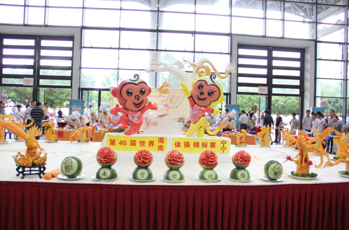 在东盟食品艺术拼盘组合展区,一组组由南瓜、西瓜、萝卜、泡沫等材料雕刻而成的作品“南南”、“宁宁”吸引了不少市民的注意。食品艺术拼盘组合比赛的裁判长告诉我们,食品艺术拼盘组合比赛主要由制作拼盘和雕刻艺术两部分组成,评委主要依据作品的造型、刀工、配色、装饰、创意以及现场卫生等来打分。“主题突出、构图新颖,造型生动活泼、形态美观,刀工细腻、工艺性强,颜色搭配得当、线条层次合理,这些都是作品的主要得分点。”