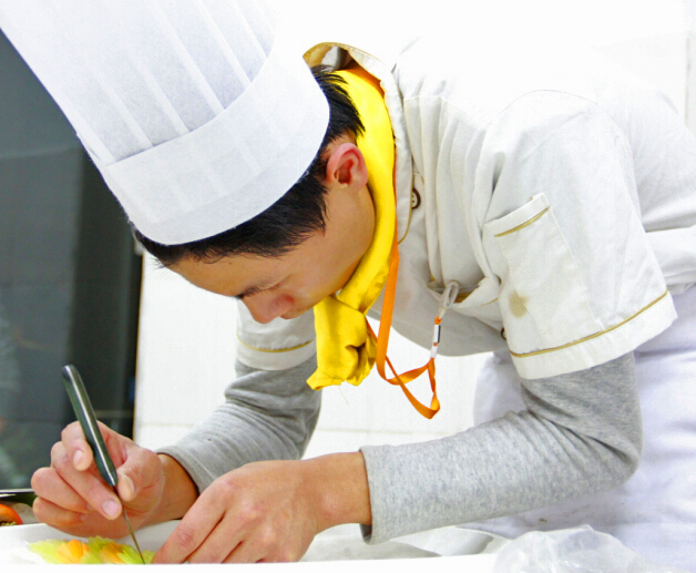 而在广西华南烹饪学校第二十届烹饪大赛冷拼组比赛场上,参赛选手正在紧张的进行着拼盘的制作。每一位参赛选手都凝眉聚神,眼观鼻,心手合一,凌厉的刀在砧板上灵活的飞舞着,奏出美妙的乐章。手腕一转,刀刃在各种食材间时而轻滑,时而勾勒,不一会儿功夫,一个个薄如蝉翼的白萝卜片、用黄瓜皮做成的金鱼等就出现在眼前。