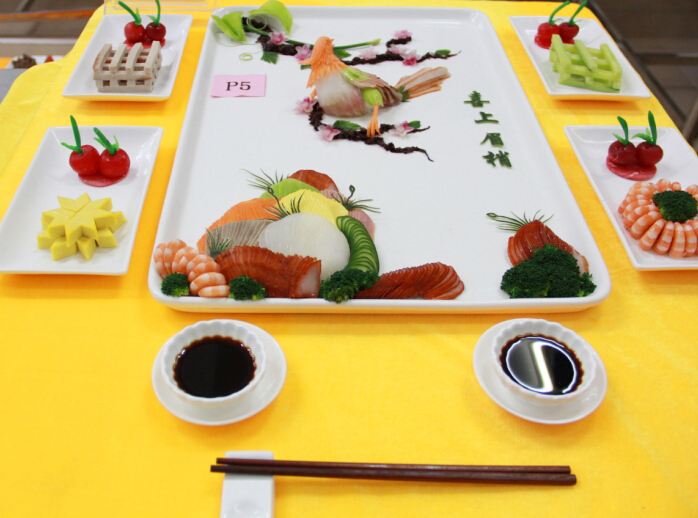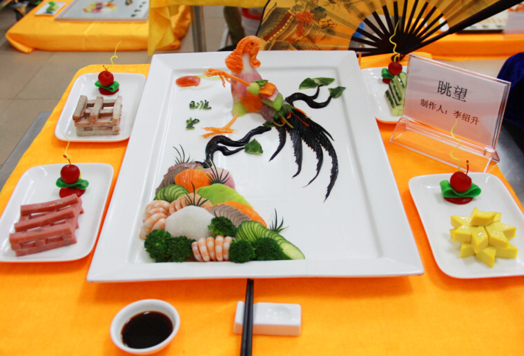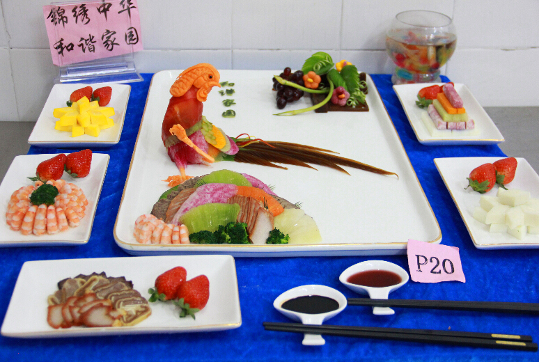 小编从评委老师处了解到,冷拼是一门非常讲究刀工、摆盘、颜色搭配和构思创意的功课。参赛选手们在赛前就开始构思参赛作品,包括选择什么样的主题,什么样的食材,食材颜色的搭配等等各方面,除了这些,在现场还要控制制作的时间。来自全校的参赛选手拿出看家本领,使出浑身解数,最后呈现出来的作品连“久经战场”的评委老师们都啧啧称赞,如《金玉满堂》中惟妙惟肖的金鱼,《锦绣中华》中闪烁的锦鸡,《大鹏展翅》中翱翔的雄鹰气势逼人,《荷韵》中优雅的荷叶,还有调皮的小蝌蚪生动形象的在荷叶下嬉戏,更有灵动的金鱼在水中嬉戏。
