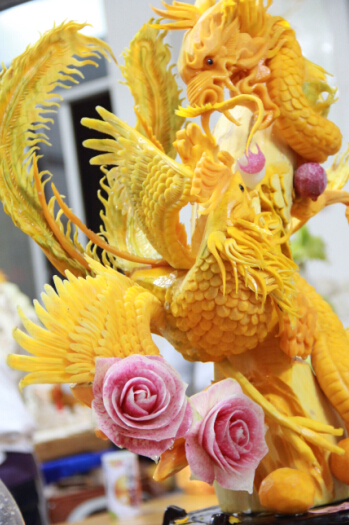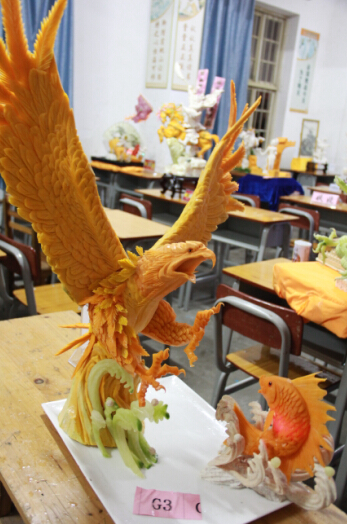 本次果蔬雕刻比赛要求参赛选手在90分钟内完成作品,虽然时间有限,原料简单,但并未难倒参赛选手。他们应对从容、游刃有余,最普通的食材在他们手中化腐朽为神奇。嫦娥奔月、马到成功、公鸣富贵、雄鹰,形象逼真、栩栩如生。他们精湛的技艺、细腻的刀法、巧妙的构思、经典的搭配,造就出一件件精美的雕刻作品,顷刻间打动评委。