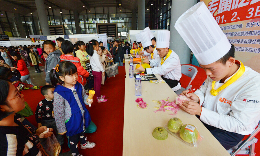 而在开幕式现场有一群身怀绝技的华南学子为吃货们送上了精彩的表演。广西华南烹饪学校的师生都拿出绝手本领,让邕城的吃货们不但大开眼界,更是一饱口福。在狂欢节现场,油炸的、香煎的、烘焙的、鲜榨的……华南的大厨们都拿出了看家本领,吃货们也是敞开了“肚皮”一路吃下去。对于这么多美食,吃货们表示,能在一个地方吃到各种美食,而且味道还这么正宗,大型蛋糕王更让现场疯狂。看表演,品美食,这些充满娱乐性的活动,让吃货们大加赞誉,纷纷表示不枉此行。华南学子们精彩的表演,展现出了我校学子精湛的技艺。