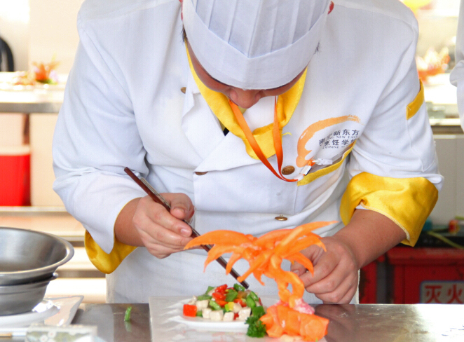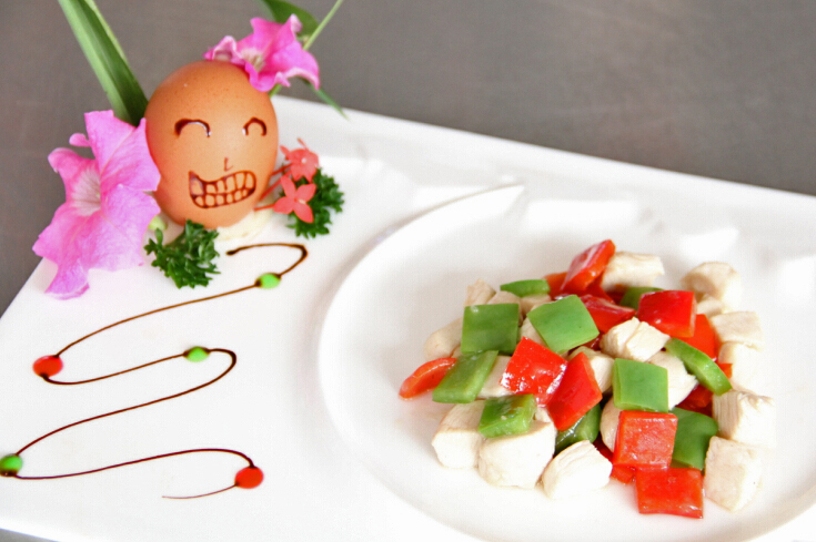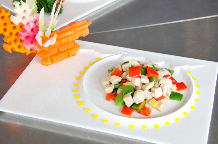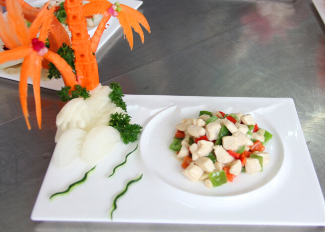这次阶段考核同学们的选材以鸡肉为主,还有各种时疏、各种水果,即便是同样的食材,每位同学的做法都不六样,常见的食材在同学们的手下变得各具特色。选手们将自己做好的菜肴装盛在盘中,然后用自己准备好的雕刻艺术品点缀好,这样六盘六盘“形、色、味……”兼具的烹饪艺术品就成功完成了。