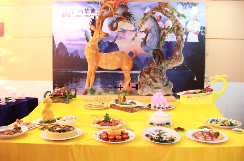 广西华南烹饪学校所设计的珍馐飘香宴,集各菜系的精华,既体现了传统名菜的风采,又表现出广西华南推陈出新的特色,整套宴席分为雕刻、冷拼、热菜、翻糖蛋糕、点心等几大部分,充分展示了青春活力激扬,华南珍馐飘香的韵味。此次团体展台组成有大型泡沫雕、热菜、冷拼、点心等各式菜系组成。华南学子现场展台泡沫雕形式各式各样、形态万千。131班的《日月同辉,龙凤呈祥》、134班的《东方美食》、136班的《全鱼宴》、金牌五班的《八仙赏宴》、《盛世龙蟠寿宴》、《壮乡情》、《双喜临门》、……,其中131展台《日月同辉,龙凤呈祥》充分体现了学子精湛的厨艺,以“八桂圣宴”为主题,雕刻“龙凤呈祥”,配以“寓意为双宿双飞”的冷拼,热菜部分由“合家欢乐”大龙虾、“花好月圆”、“九转大肠”等六款作品组成,四款点心,中西结合,款款相映,珠联璧合。