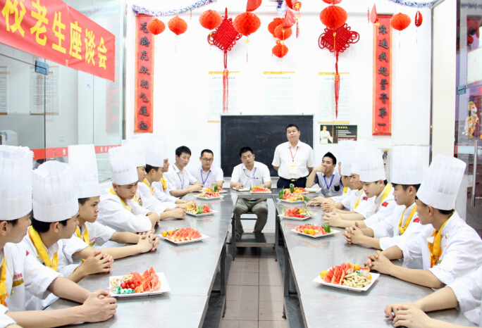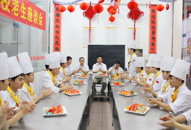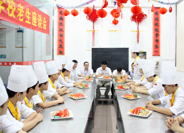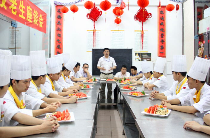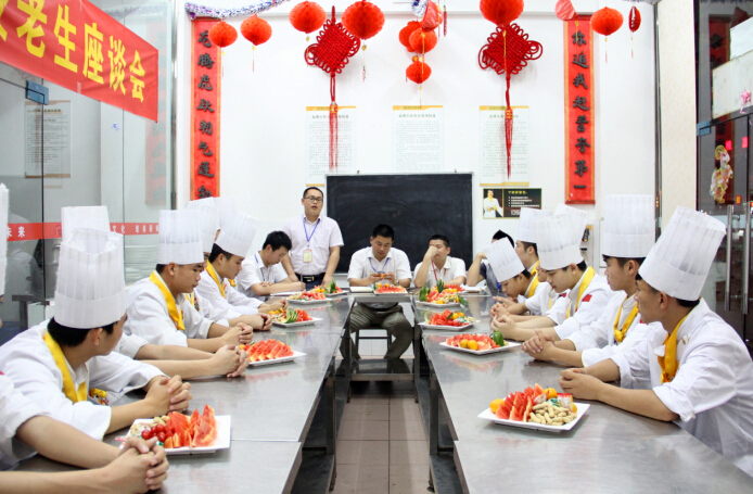 校区负责人朱伟、教务处主任黄盛大师和校区主任赖学学一一发言,雕刻大师杨罗银简单的介绍了下一步同学们学习的雕刻、拼盘以及现代厨房的规范操作流程;教务主任黄盛大师分享一些他的从厨经验,下一步学习的课程和重点,并对学子们的未来职业规划予以提示和建议;校区主任赖学学主要从日常生活中的一些学习和做人做事给与了同学们建议;校区负责人朱伟从就业方面为同学们介绍了烹饪行业的发展状况与前景并希望学子们珍惜在校时光勤练基本功,努力提高综合职业素质,不断提升自己的厨艺和职业修养,为今后进入知名餐饮企业做好准备。