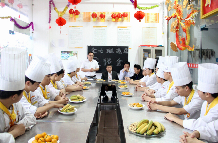 首先学生代表及班长向领导老师汇报了班级学习生活的情况以及需要改进的地方。教务主任中国烹饪大师黄盛大师,就如何成为一个优秀的学生和同学们做了交流。并介绍了接下来学习的重点、学生上课要注意的问题等方面跟同学们做了详细的交流。校区主任赖学学就同学们的日常生活学习提出了建议和意见,在学习上要认真,学会做人做事。校区负责人朱主任跟同学们谈谈一个优秀大师的必备条件,在校学习期间如何成为一个优秀合格的学生做了要求。又就餐饮发展前景、酒店用人的标准与要求,以及华南的合作单位和同学做了介绍,让同学们认真学习,工作一定有保障。