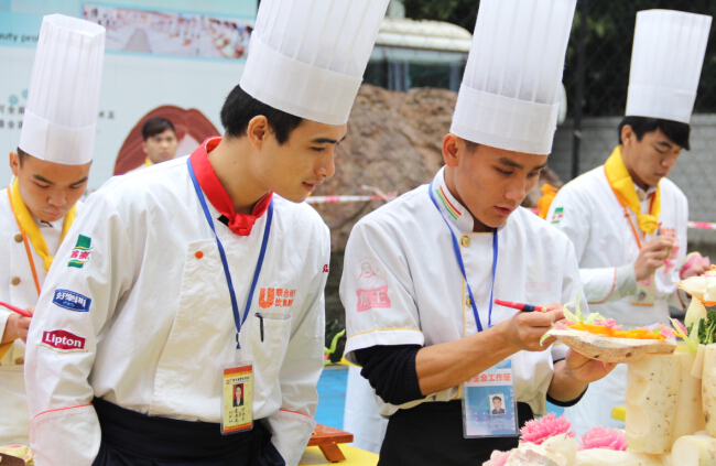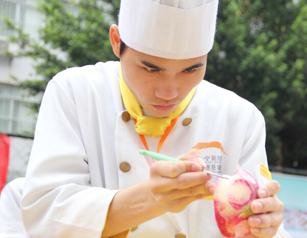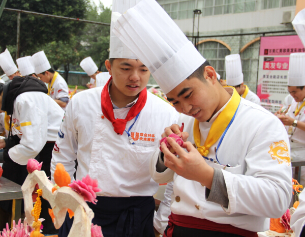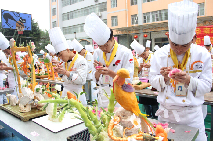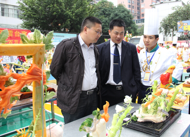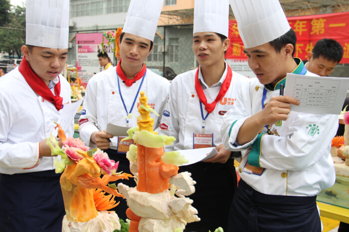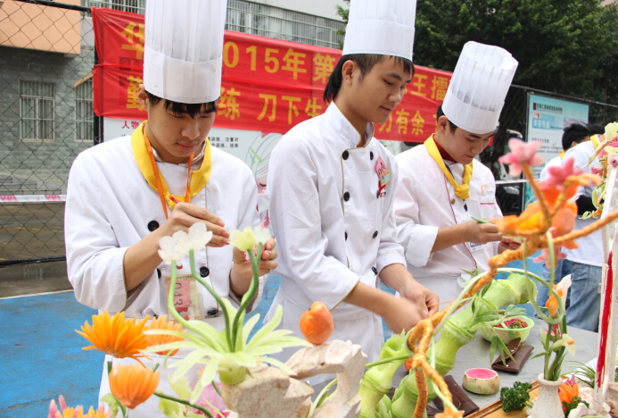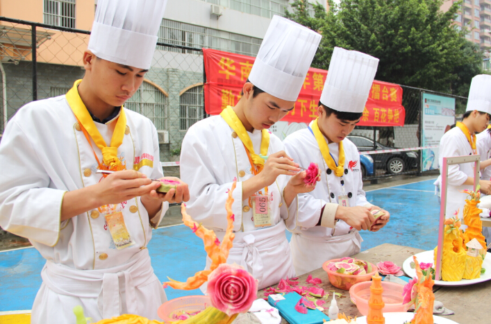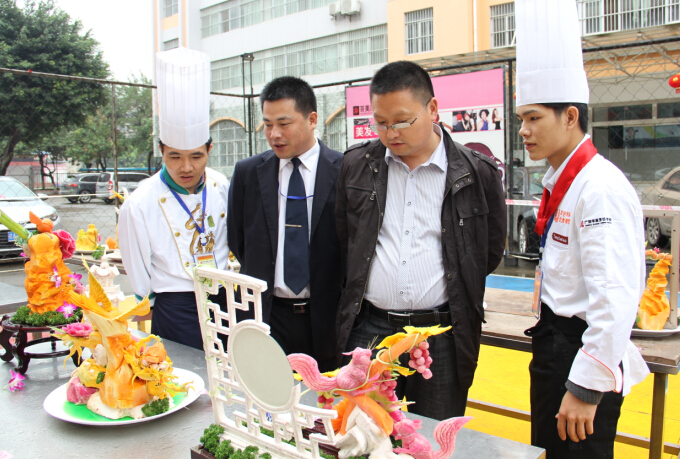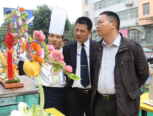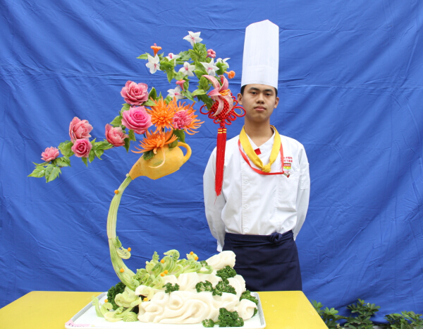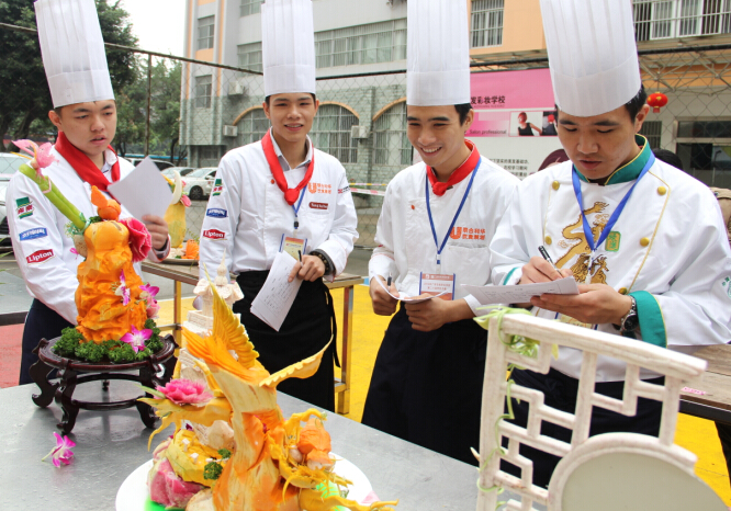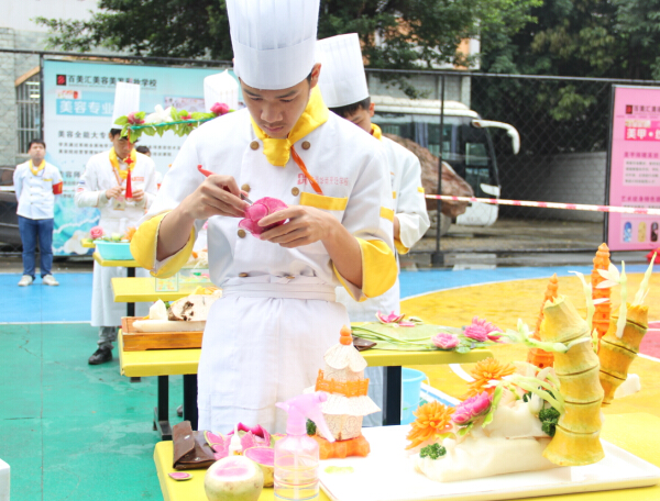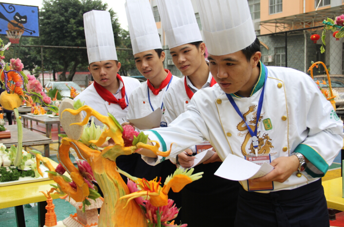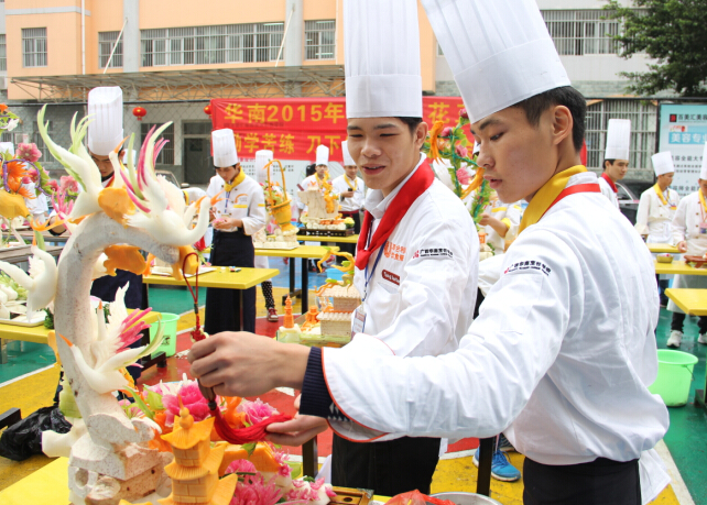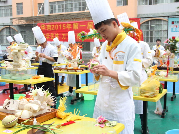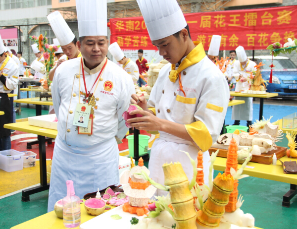 评委老师说,果蔬雕刻是装饰菜肴、美化菜肴、提升菜肴品质,烘托宴会气氛一种惯用技术,而大型的雕刻展台更是能够跟人们一种视觉上的冲击和享受。果蔬雕刻师艺术与技术的有机结合,并要求在短时间内完成。它不仅能表现作者对美好生活的向往,也是对宴会主题的体现。学校希望通过这样的比赛来提高华南学子们的竞技精神,不断创新、勇于拼搏,将来走出学校,面向社会,可以有过硬的技术和智慧的头脑闯出属于自己的一片天空。