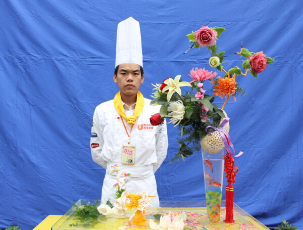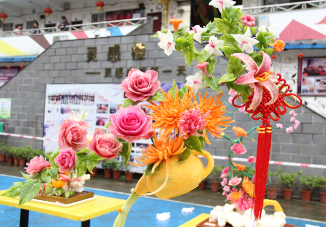 雕刻现场,参赛选手们沉着冷静,南瓜、白萝卜、胡萝卜、冬瓜等这些常见的蔬菜到了华南学子的手里就有了生命。只见他们个个刀工手法娴熟,一会用直刀,一会用旋刀。在短短的40分钟,刚才还是我们日常生活所常见的蔬菜摇身一变,有的变成了一朵朵美丽的玫瑰花,有的变成了绽放的菊花,有的变成了青翠欲滴的百合……,百花争艳香满园,草树知春不久归,百般红紫斗芳菲,一幅幅精彩的作品把校园操场点缀成了花的海洋。选手们用他们的智慧和在学校里练就的过硬的技术巧妙的将蔬菜结合在自己的创意里,创作出一个个美观向上、创意鲜明的作品。