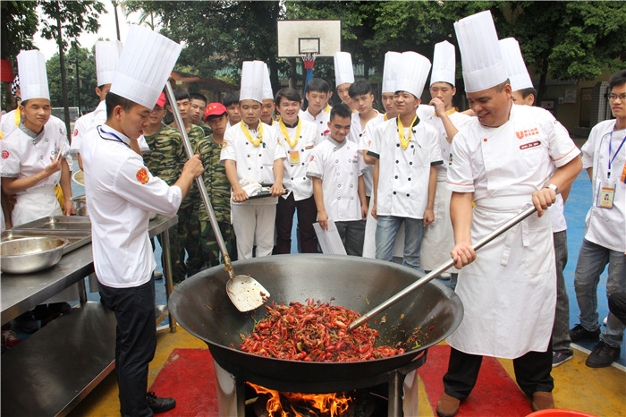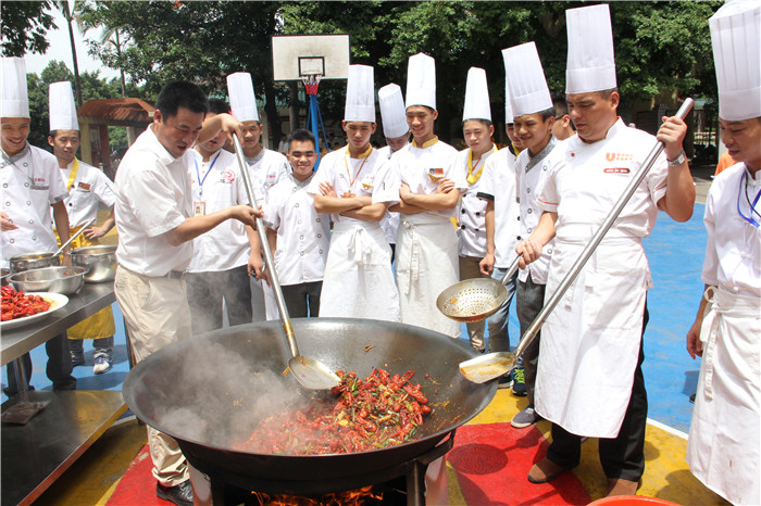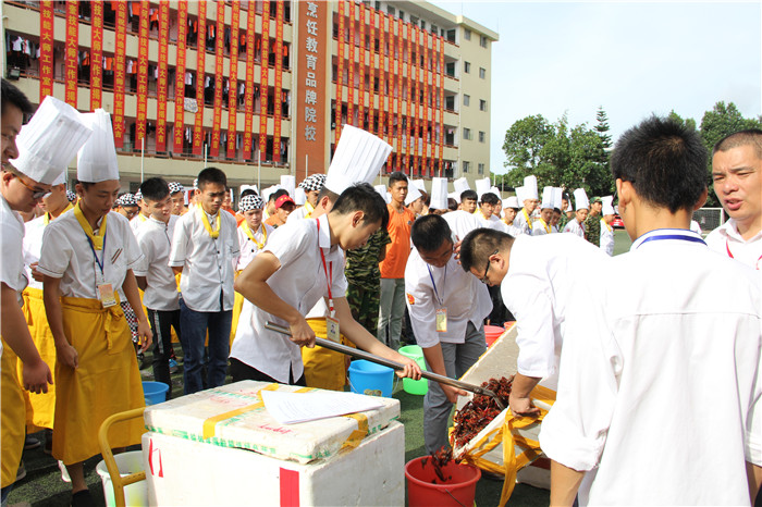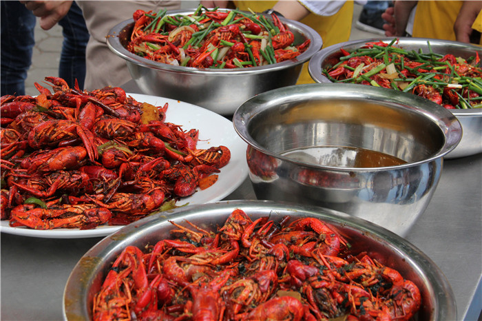 7月20日上午,广西华南烹饪学校小龙虾美食节在中尧校区举行。早上8点,在各班老师的带领下,开始刷洗小龙虾、去除虾线、进行烹制,直至上午11点,香辣、麻辣、孜然、蒜香、五香、酱香等六种口味的小龙虾才陆续出锅摆盘,放到长廊上的展台供参与美食节的区政府领导、广西餐饮界的中国烹饪大师和餐饮同行们以及来校参观报名的各位家长和同学们品尝。