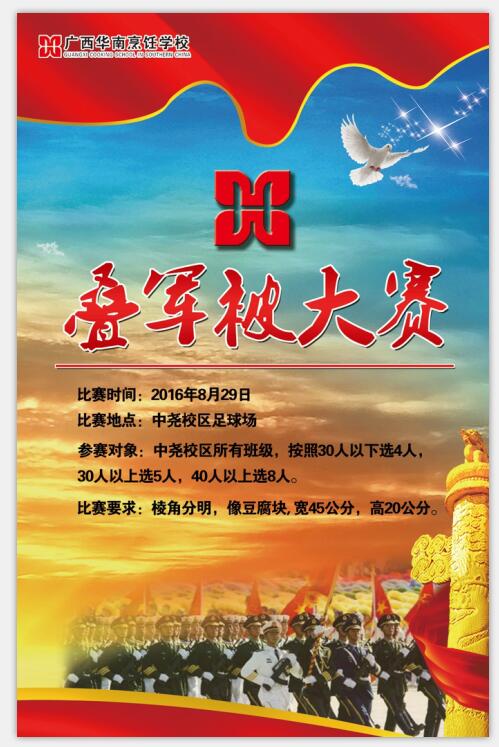 广西华南烹饪学校2016年新生军训已经拉开帷幕,为了让同学们尽快适应军训生活,提高内务整理能力,以军人的标准严格要求自己。学校将定于8月29日,举行一场叠军被大赛,让同学们能在比赛成长,更好的严格要求自己。