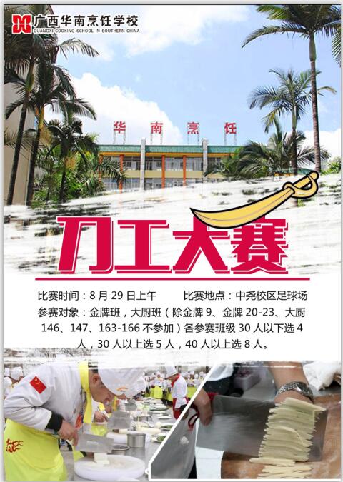 中国有菜肴数万种,而导致菜肴千变万化的主要因素就是刀工。烹饪行业历来就有“三分炉子,七分墩子”、“无刀不成菜”之说,由此可知,刀工好不好对一个厨师来说是至关重要的。广西华南烹饪学校毕业生在业界素来就有“基本功扎实、烹饪技能过硬”的美称。因此,为更好提高学生刀工技巧,培养学生勤练基本功的性格,学校将于8月29日上午,在中尧校区足球场举办刀工比赛。