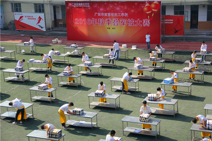 为了让同学们提高内务整理能力,以军人的标准严格要求自己。8月29日上午,一场叠军被比赛在广西华南烹饪学校操场上热闹的进行着。