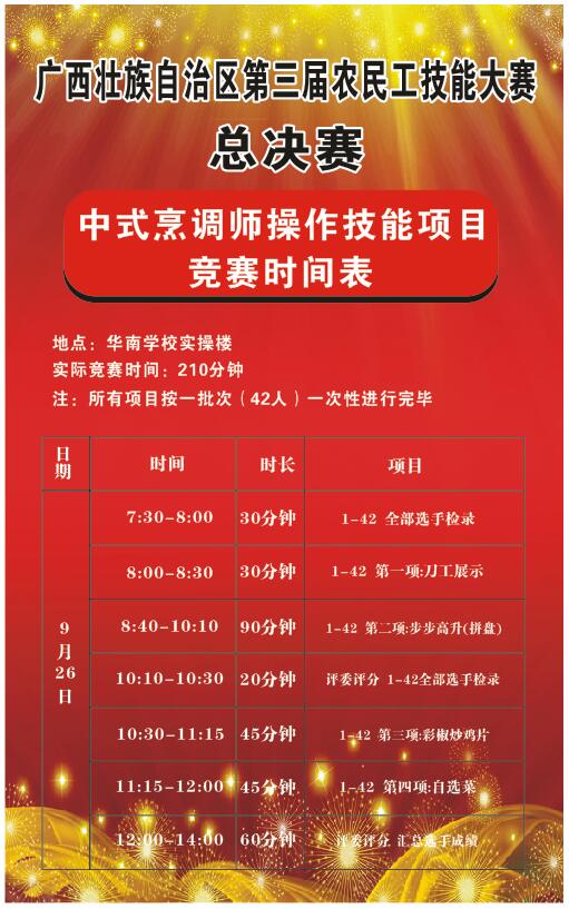 第三届农民工技能大赛(中式烹调师)总决赛将于9月26日上午,在广西华南烹饪学校开赛,下面我们就来了解下比赛当天的日程安排。