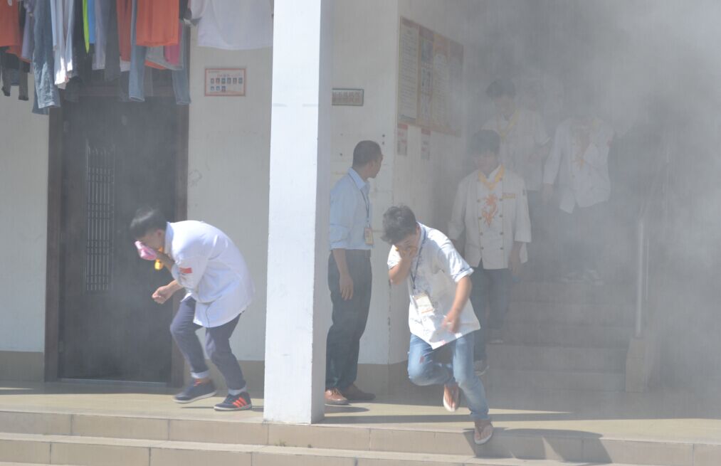电铃一响,学生们迅速从防火通道口撤离。只见他们一个个表情严肃,用手捂住口鼻,迅速而有序的从通道口撤离“火灾”现场。楼内疏散人员按照预先的消防演习方案疏散学生,保证在楼内学生的安全,以免慌乱中出现拥挤或者踩伤学生现象。学生们逃生到操场之后,就会找到相应的队伍排成方队。接着来着广西消防总队的兵哥哥亲自给全校师生示范怎样用灭火器灭火。 本次消防安全疏散演习在学校后勤部的认真组织下,是一次必要的、成功的师生安全疏散演习。这次演练活动,师生高度重视,各工作人员各就各位,各司其职,认真负责,确保活动万无一失。通过演习,使大家更加明确,一旦发生火情,每个人应该做什么;如何正确报警;如何正确扑救;如何疏散学生;如何自救和逃生,也学会了如何用灭火器灭火。
