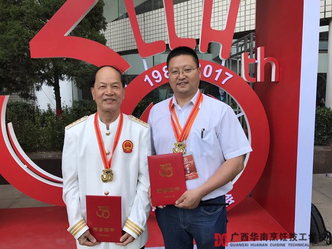 国家级烹饪大师何逸奎与广西华南烹饪技工学校校长翟维铁合影