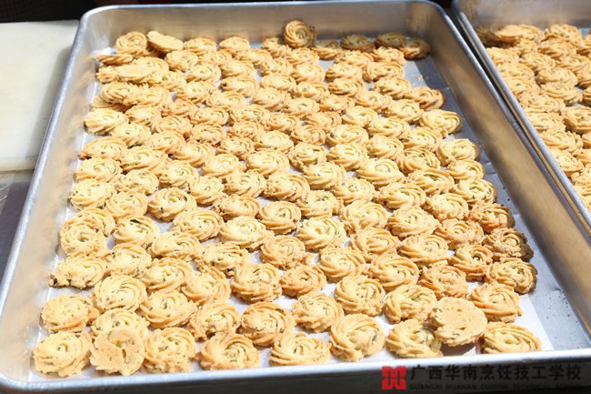 很快,烤盘里装满了一个个成形的曲奇饼。需要注意的是,烤箱得提前预热,预热温度要150度。烤制的窍门是,小烤箱170度烤制20分钟,大烤箱180度烤制25分钟。香喷喷的曲奇饼新鲜出炉,居民们品尝后交口称赞。