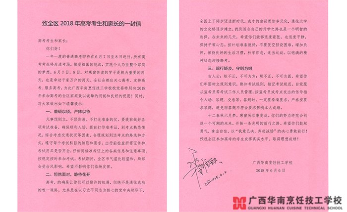 一年一度的普通高考即将在6月7日至8日进行。所有高考考生将走进考场,接受祖国的挑选,实现个人乃至整个家庭的梦想。6月7日、8日,对寒窗苦读的学子是极为重要的两天,也是牵动千家万户的两天。全社会都应关心高考、支持高考、服务高考,为此广西华南烹饪技工学校校党委特别向2018年参加高考的全区家庭致以诚挚的问候和良好的祝愿!同时,对大家做出如下温馨提示: