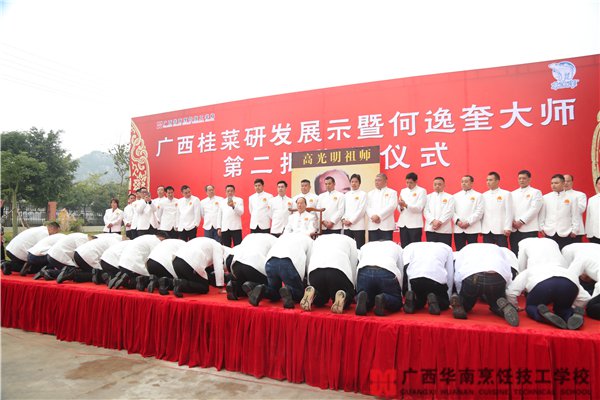 所以,当一场重现中国古代拜师礼仪的厨师“收徒仪式”举行时,可以说震惊了广西餐饮界。说震惊,是因为中国烹饪大师收徒时,徒儿需行跪拜礼,并敬清茶,递拜师贴。确实,中华饮食文化博大精深,需有授业者也需传承者,这才是厨艺、厨技、厨德源远流长之道。