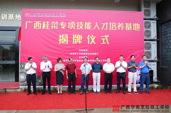 2019年5月31日上午,广西桂菜专项技能人才培养基地在广西华南烹饪技工学校正式揭牌。广西人力资源和社会保障厅领导,广西烹饪协会领导、桂菜大师、合作单位领导等共100多人参加了揭牌仪式。