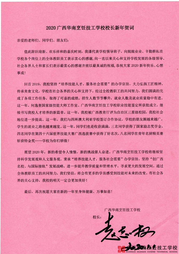 回首2019,我校坚持“培养技能人才,服务社会需要”的办学宗旨,大力弘扬工匠精神,传承美食文化,学校在社会各界的关心和支持下,经过全校教职工的共同努力,我们圆满的完成了各项工作任务,取得了可喜的成绩。招生人数节节攀升,就业人数及就业质量稳中有进。这一年,何逸奎国家级技能大师工作室、广西华南烹饪技工学校职业技能鉴定所获批成立,继续书写我校人才培养的新篇章。这一年,我校被广西教育厅评为自治区三星级校园,我校社会地位进一步提高。这一年,我们与四所澳大利亚学校签订合作协议,学校的朋友圈越来越广,学生的就业之路也越来越宽。这一年,同学们也是收获满满,三名同学获得了国家励志奖学金,四名同学在第四十六届世界技能大赛广西选拔赛中获得了好名次,八名同学在青年名厨精英赛斩获特金奖,学校为为你们骄傲。