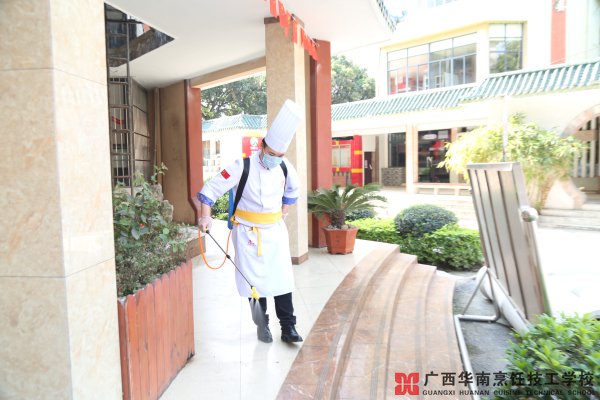疫情前线激战正酣,全国紧急动员。广西华南烹饪技工学校也积极应战,全面投入到了宣传战役中来。与此同时,学校值班老师每天都会对校园、教室、办公室、食堂、宿舍等进行严格的消毒工作,保证无缝隙无死角,让病毒无藏身之处。