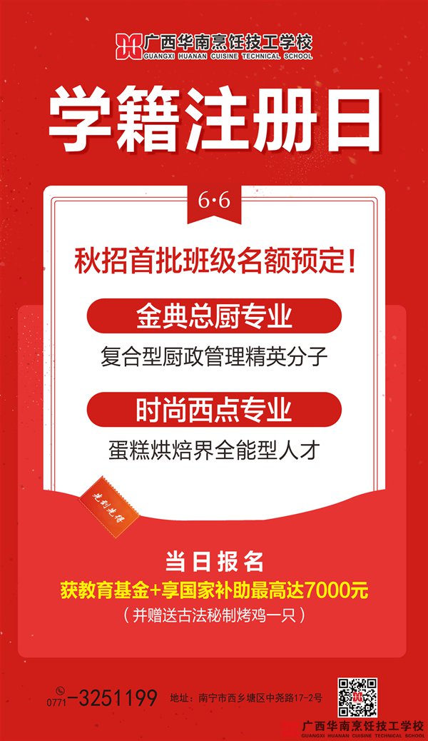 当天还是华南烹饪学籍注册日,我们的秋季首批班级名额预定即将开启,推出各大专业限时教育基金与助学补贴,让对烹饪感兴趣的你能选到专业的好学校。