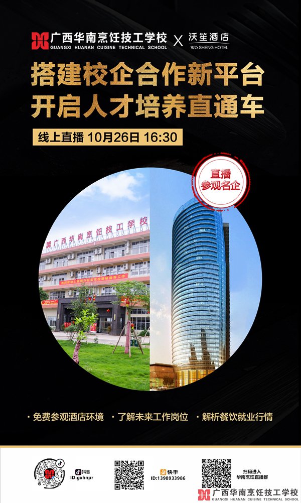 为进一步推进各专业教学与市场接轨,实现我校学子学习和就业的无缝对接,提高学生就业质量,广西华南烹饪技工学校创就业指导中心的老师联合广西沃笙酒店,将于下周一采用线上直播的方式,对学校合作企业进行线上参观学习,搭建校企合作新平台,开启人才培养直通车。