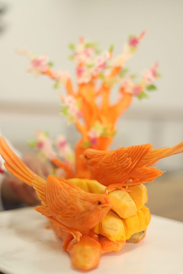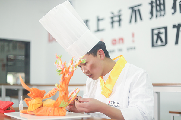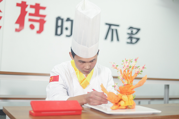 都说学烹饪有十八般武艺,刀工、勺功、雕刻、热菜、冷拼一应俱全。王洪表示,现阶段课程正学到凉菜阶段,相对他而言,自己对雕刻、拼盘等内容更加感兴趣。烹饪它是一门技术,需要动手实操学习,在不断地实操学习中强化自己的技能,于是王洪会利用课余时间练习雕刻手法,也会充当老师的小助手,在班主任韦格启的带领与指导下学习到更多雕刻小技能,常常晚上12点才回宿舍休息。