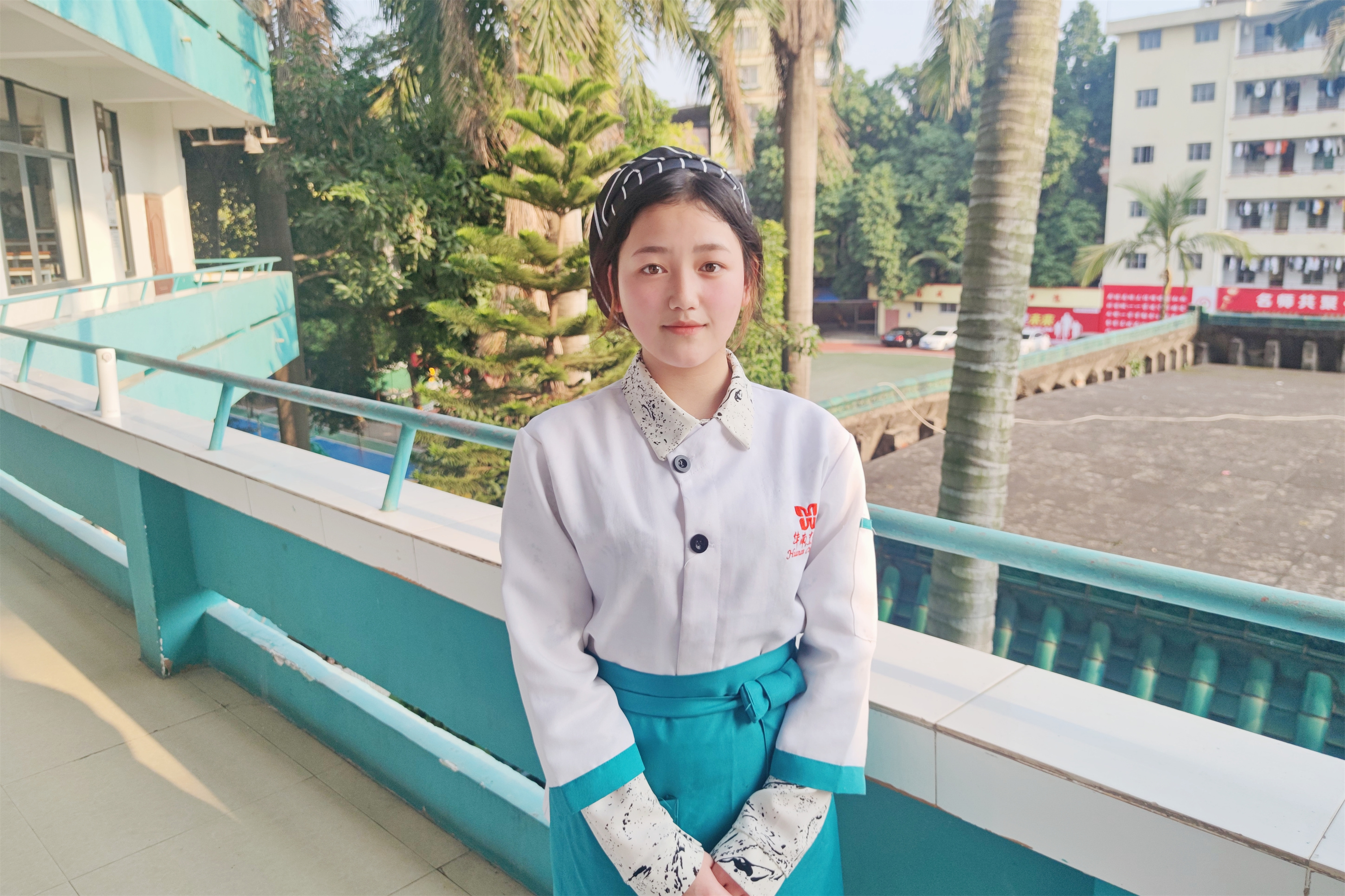 罗丽演来自广西百色,是一个活泼、爱笑的小女孩,在去年高一暑假转学到我校就读了西点技工专业。罗丽演同学认为按部就班地读书不适合自己,上了高中读了一年之后觉得高中的理论课程非常枯燥,自己也学不进去,成绩表现一般的她对未来感到十分担忧,之后偶然一次在快手刷到了华南烹饪上课的视频,经过了解之后,觉得西点是一个时尚有前景的行业,同时学习西点还可以让人安静,提升自身气质,于是在心中种下了成为西点师的梦想。