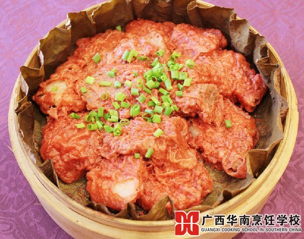 此菜系将五花猪肉切成厚片,加调料和炒香米粉拌匀蒸熟,再以鲜荷叶包裹稍蒸而成。成菜后,荷叶翠绿,肉质酥烂,肥而不腻,是难得的夏令美食。