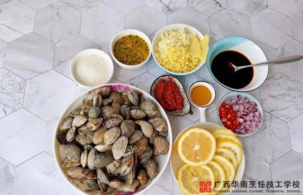 1、准备好食材,花甲放盆里,加一勺盐和几滴食用油,泡一个小时吐尽泥沙,然后清洗干净,其他配料都准备好。